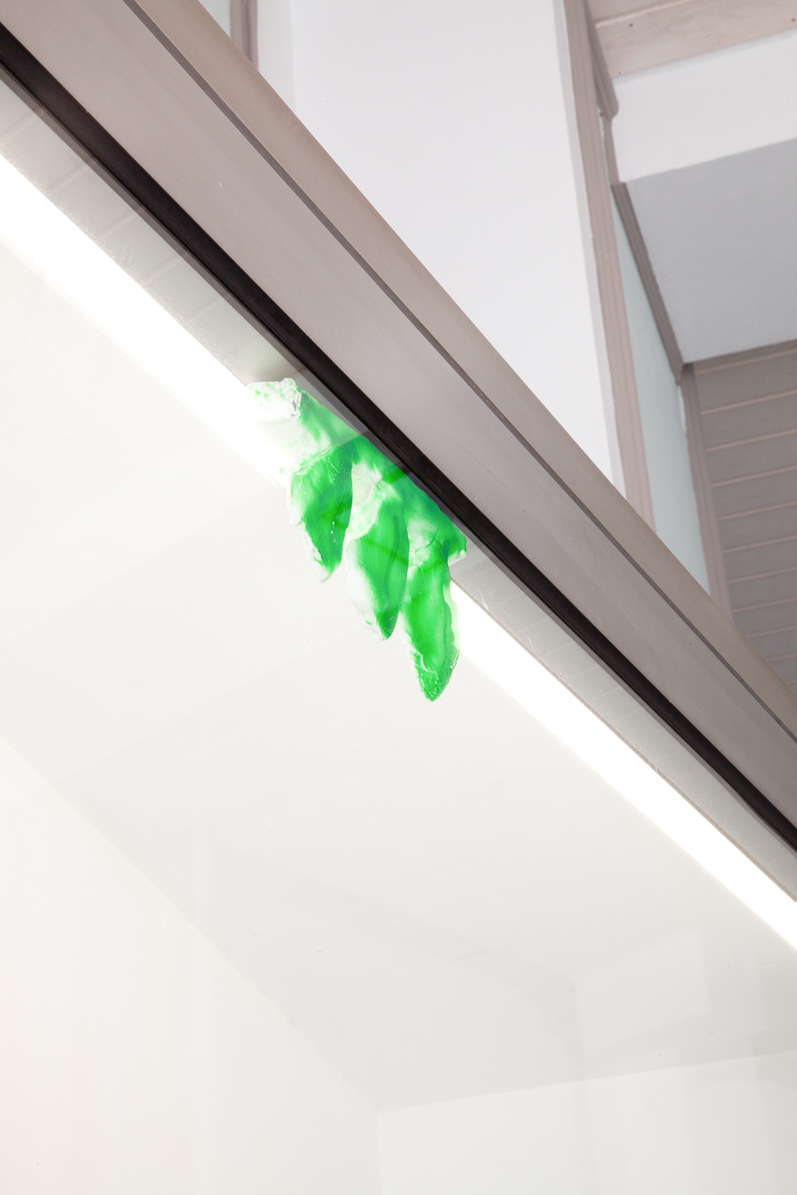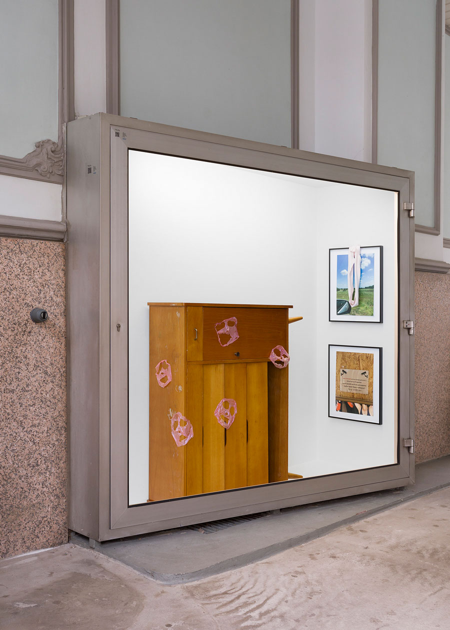 Peeled off face masks haunt the shoe cabinet in the passageway. The empty shells are scattered across the wood, like chewing gum defiantly stuck under school desks. Their hollow eyes stare into the harsh neon light. The shoe cabinet, already mentioned in the exhibition text for ‘Hyaluron’, makes its first public cameo here.