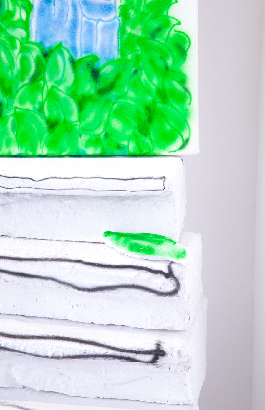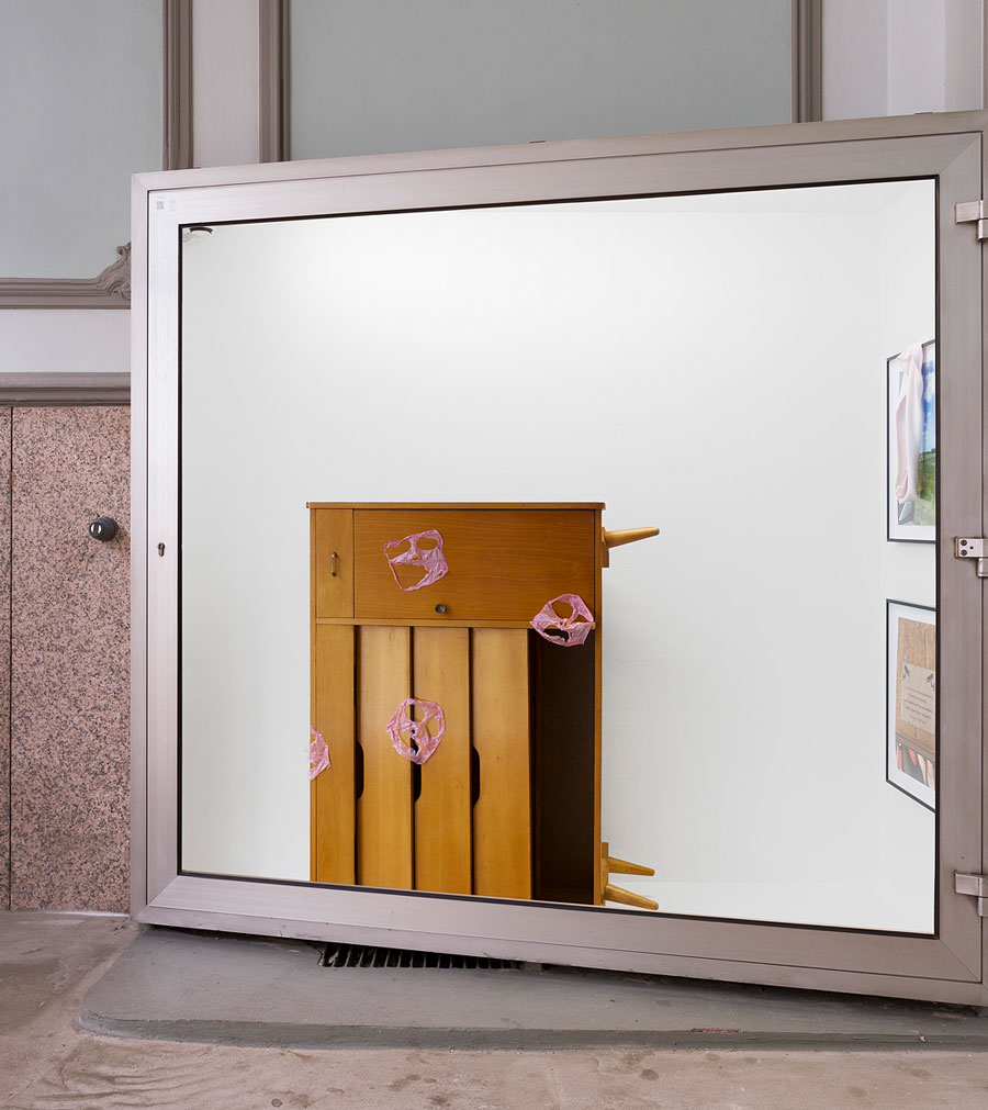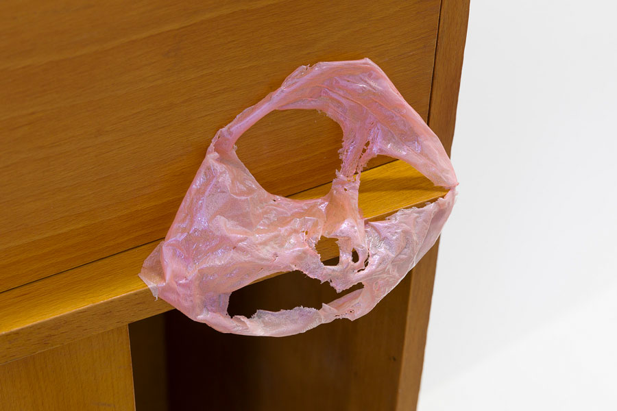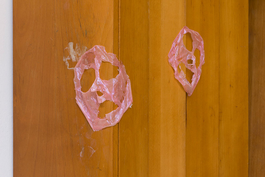 Abgeknubbelte Gesichtsmasken spuken über den Schuhschrank im Durchgang. Die leeren Hüllen haben sich auf dem Holz verteilt, wie Kaugummis, die trotzig unter Schultische gedrückt wurden. Ihre leeren Augen starren ins grelle Neonlicht. Der Schuhschrank, von dem bereits im Ausstellungstext zu ‘Hyaluron’ die Rede war, hat hier seinen ersten öffentlichen Cameo-Auftritt.