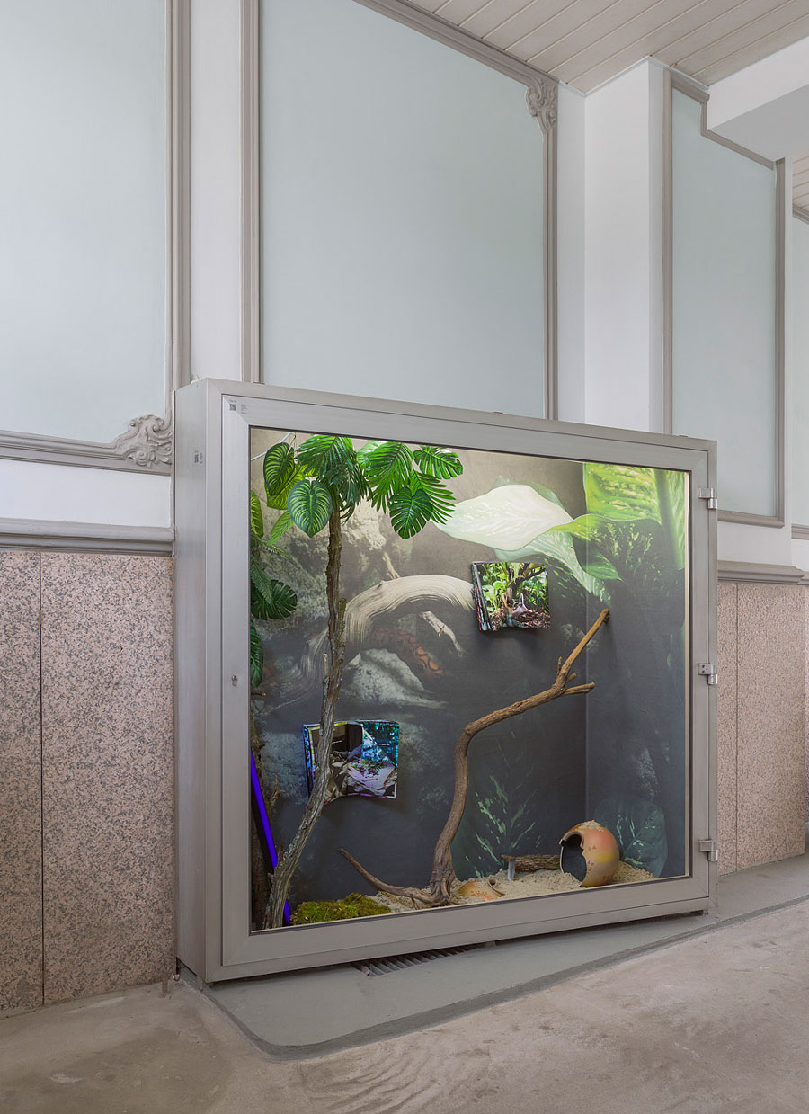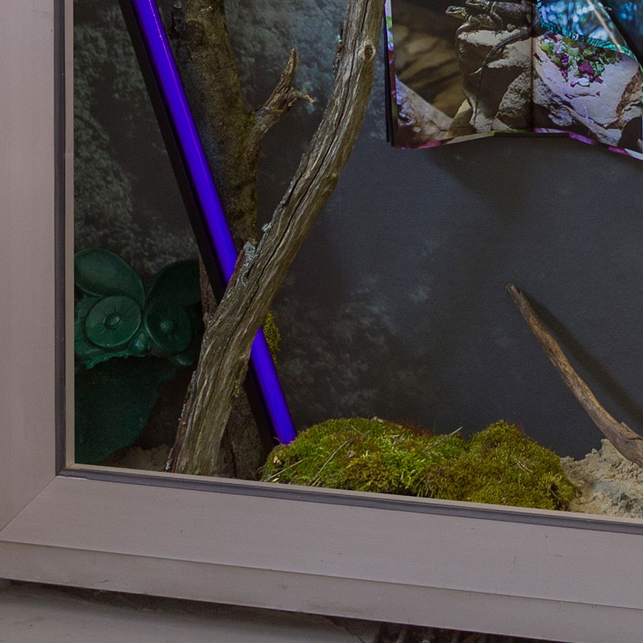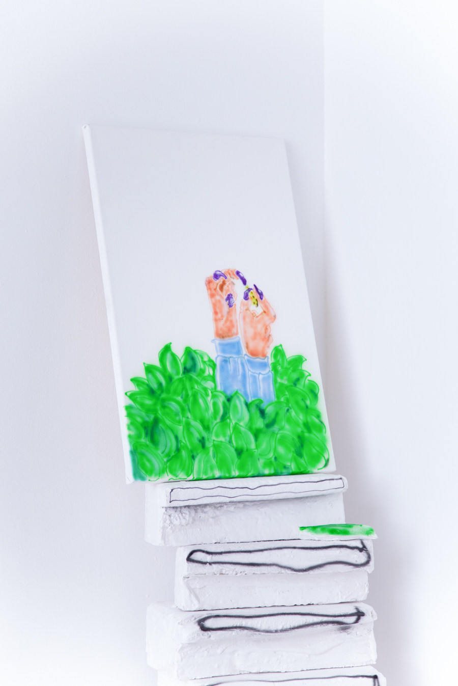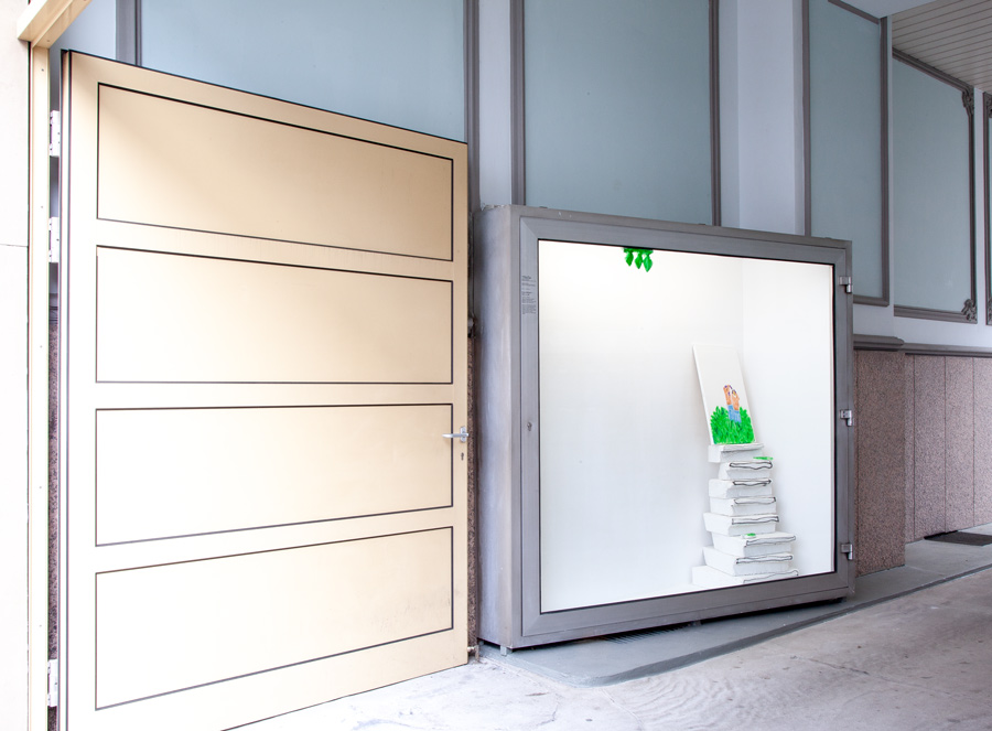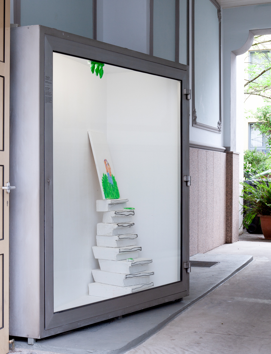 Der Blick in den Ausstellungsraum TheTip bleibt unerwidert, der einzige Halt ist ein Paar himmelwärts strebender Klauen. Hofmanns Protagonist:innen haben sich nicht einmal mehr die Mühe gemacht zu ihrer Ausstellung Jail in a Jail zu erscheinen. Etwas bedröppelt gar unserer enttäuschten Vorfreude auf neue Charaktere und Konstellationen, blicken wir in eine fast leere Vitrine. Links oben zeigt sich noch eine kleine Rahmung durch herabhängende Blätter, ansonsten dominiert das Weiß des Ausstellungsraumes.
